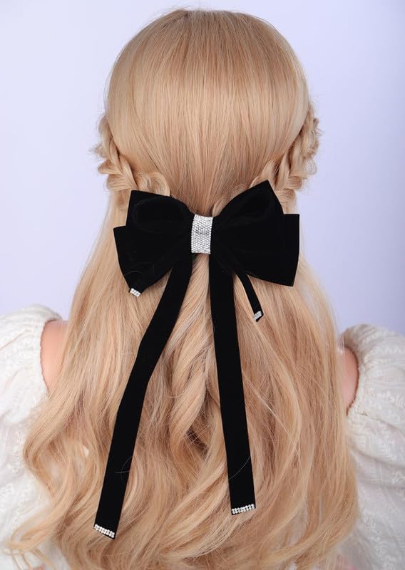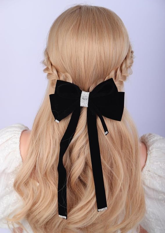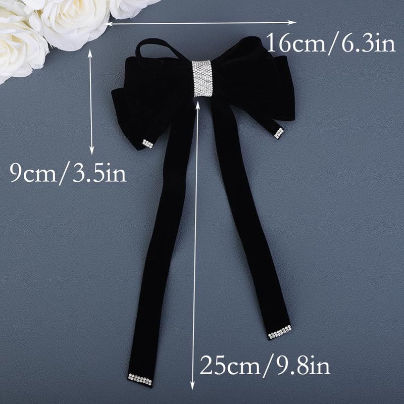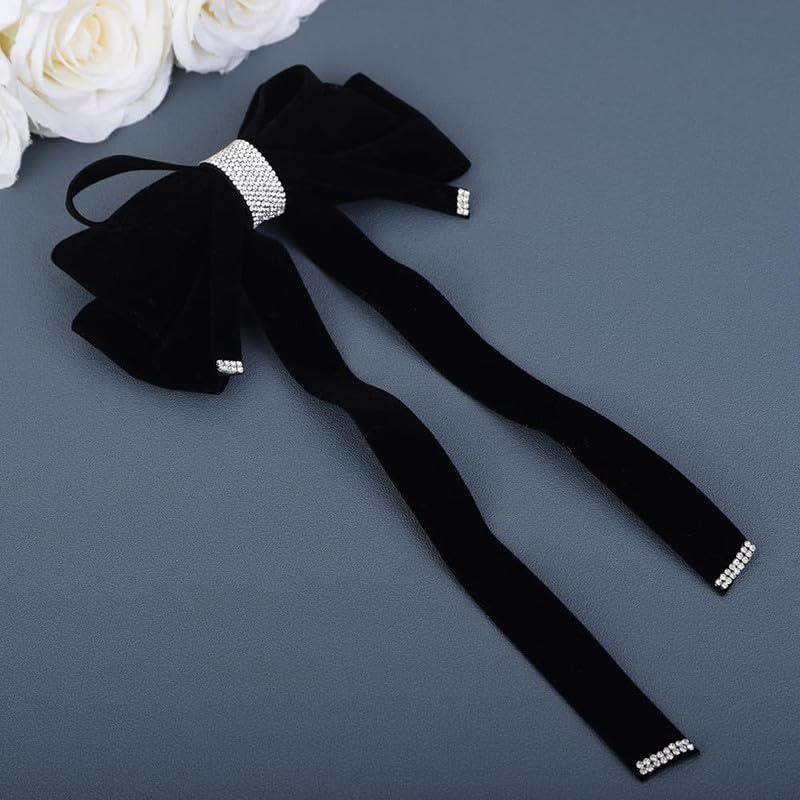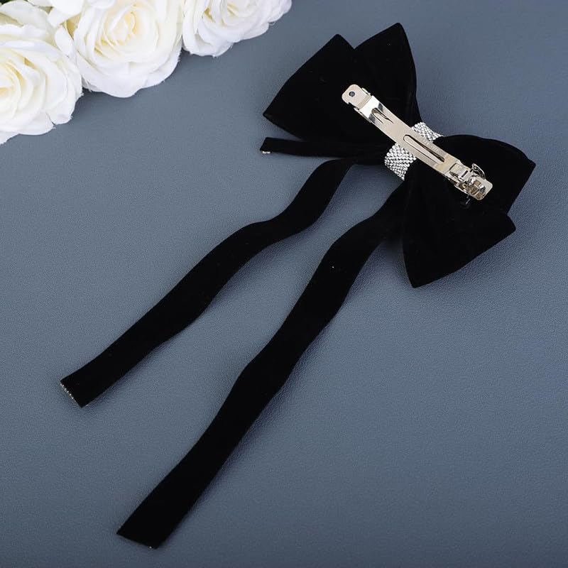 CHIROGRAPHY - 1 Pcs Luxury Black Velvet Hair Bow Clip Sparkly Rhinestone Bowknot with Long Tail Tassel Ribbon Large Ponytail Holder Accessories Metal Clip Hair Barrette (Black)
