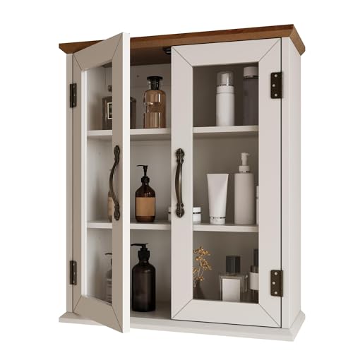 ChooChoo - خزانة طبية خشبية مع أبواب اكريليك من تشو تشو، خزانة حائط للحمام مع أرفف قابلة للتعديل فوق المرحاض، خزانة ريفية مثبتة على الحائط للحمام والمطبخ وغرفة المعيشة، أبيض ناعم وبني