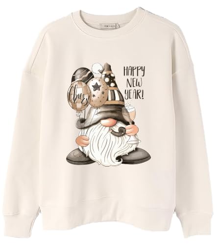 Generic - Christmas Holiday Gnome Print Sweatshirt,Beige Cotton Blend, Happy New Year Theme, Winter Holiday Casual Pullover Size (S)