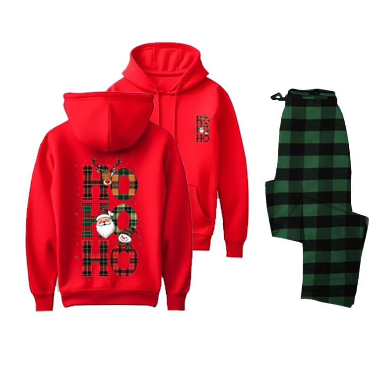 Generic - طقم هودي وسروال بيجامة للكريسماس، هودي احمر بتصميم كاروهات هو، سروال بنمط مربعات خضراء، مقاس مناسب للعطلات (مقاس L)