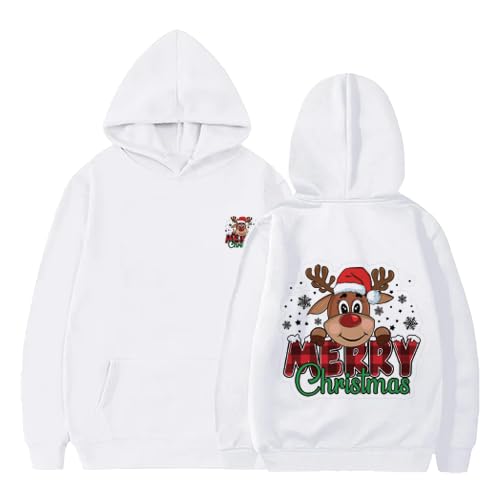 Generic - هودي للكريسماس، بلوفر قطني ابيض مع تصميم عيد ميلاد سعيد الرنة، مقاس (M)