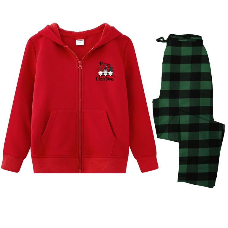 Generic - طقم بيجامة للكريسماس، هودي بسحاب احمر مع اقزام عيد الميلاد المجيد، سروال اخضر منقوش، قطعتين مقاس العطلة (M)