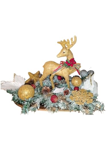 Generic - قطعة مركزية بنمط غزال الرنة للكريسماس، غزال ذهبي لامع مع توت احمر وفيونكة منقوشة، ديكور طاولة العطلات