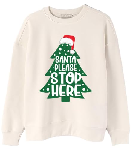 Generic - Christmas Sweatshirt with Santa Please Stop Here Design,Beige Cotton Pullover with Green Tree Print, Holiday Theme Size (M)