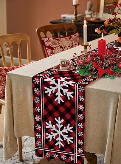 - عزّز منزلك - يضيف مفرش الطاولة المنقوش باللون الأحمر والأسود للكريسماس مظهرًا جديدًا وأنيقًا وجميلًا إلى طاولتك واحتياجات التزيين. يمكن استخدامه بمفرده أو مع مفرش ترابيزة أو أي مفارش أو مناديل أخرى لإضافة لمسة من الجمال إلى ديكور غرفة الطعام، كما يعد مثاليًا لحماية الترابيزة من بقع الطعام والخدوش وعلامات الحلقات التي تتركها الأكواب والتلف الناتج عن الأوعية الحارة