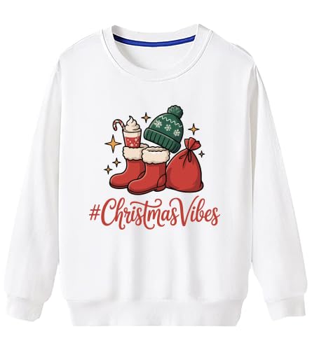 Generic - Christmas Vibes Sweatshirt, White Cotton Winter Holiday Pullover with Festive Graphic Print, Santa Boots and Hat Design Size (XL)