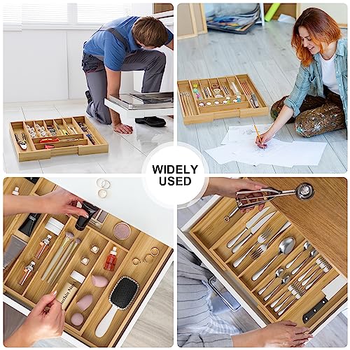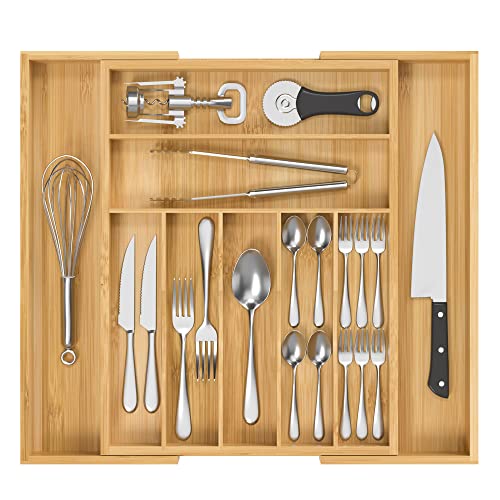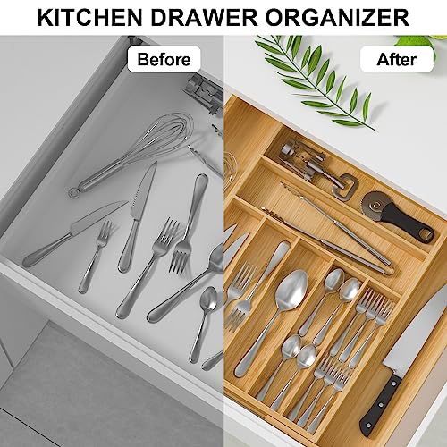 - NO MESSY DRAWERS - The utensil drawer organizer features 9 compartments. The fixed 7 compartments can be used to classify flatware such as dinner knives and forks, and the expandable compartments on both sides can accommodate larger kitchen cookware. All kitchen utensils can be easily sorted and look organized.