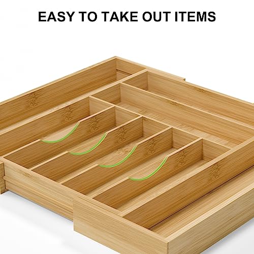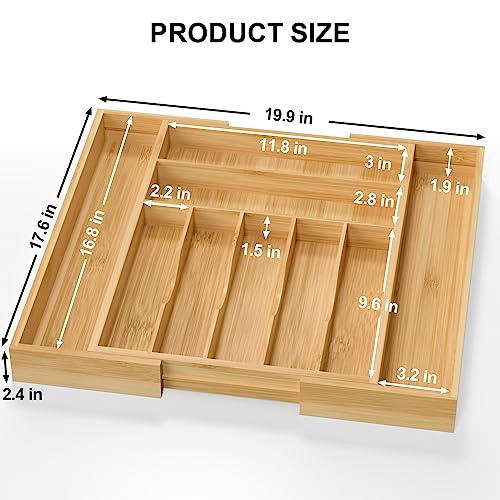 - PREMIUM BAMBOO MATERIAL - The silverware organizer is made of 100% bamboo, which is durable and easy to clean. Just wipe the silverware tray with a damp towel and air dry thoroughly, dishwasher is not suitable.