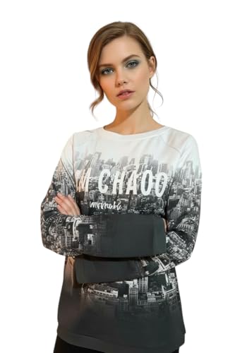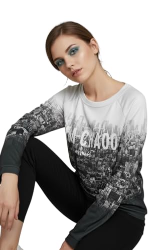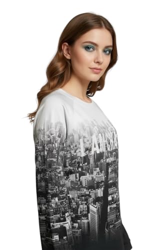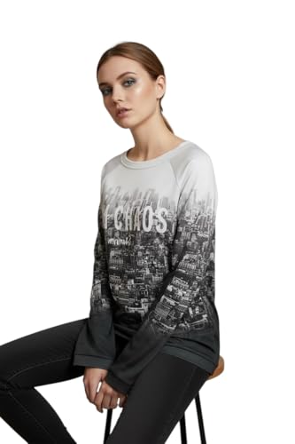Generic - سويت شيرت نمط المدينة مع طباعة صورة مدينة متدرجة، أبيض وأسود، تصميم عصري مع نقش CHAOS المقاس لارج