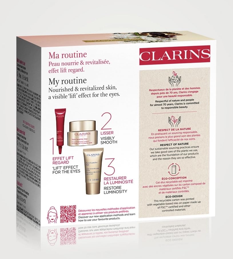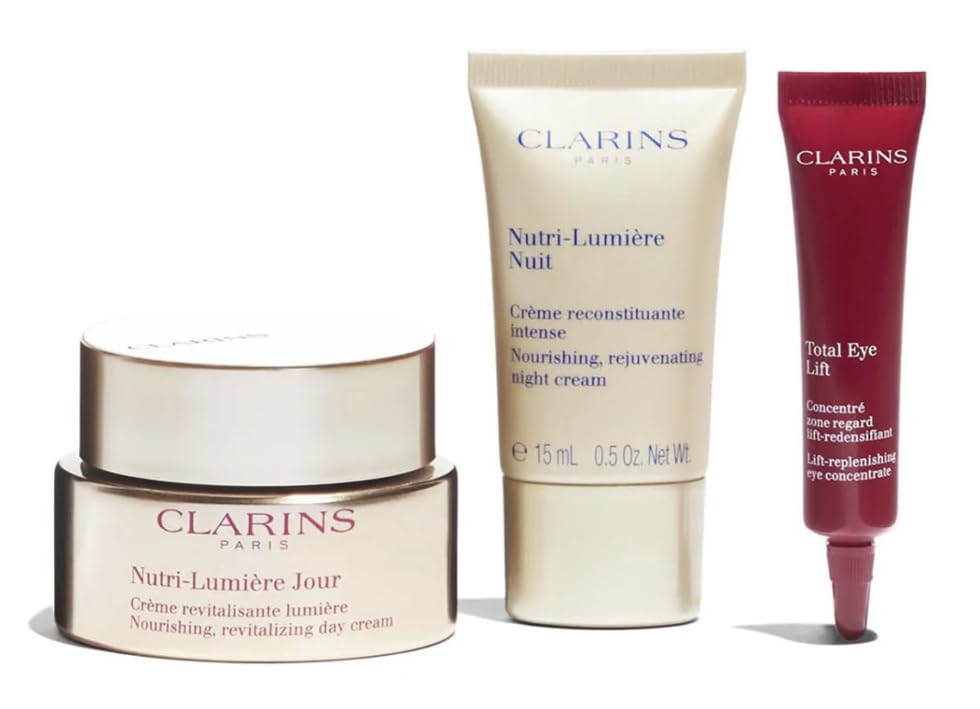 - CLARINS Nutri Lumière Starter Kit: 1. Nutri-Lumière Day Cream (50ml) 2. Nutri-Lumière Night Cream (15ml) 3. Total Eye Lift (7ml)