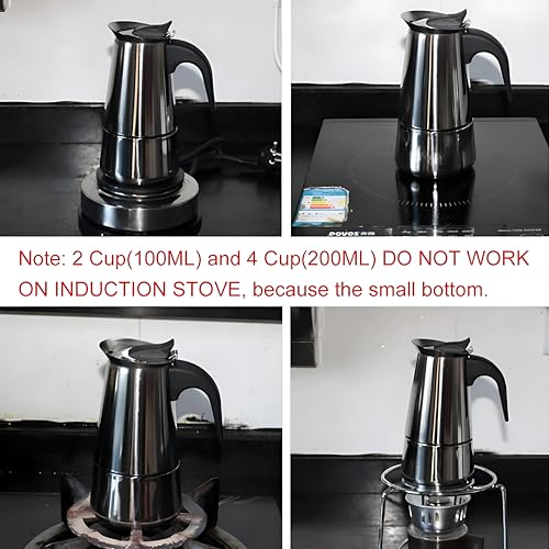 - Designed for a 4-cup (200 ml) capacity, it targets espresso lovers seeking a rich, aromatic brew, while acknowledging smaller sizes do not work on induction.