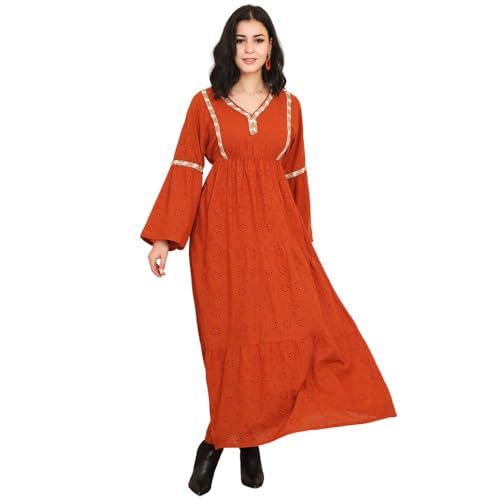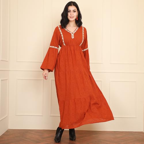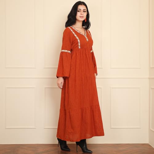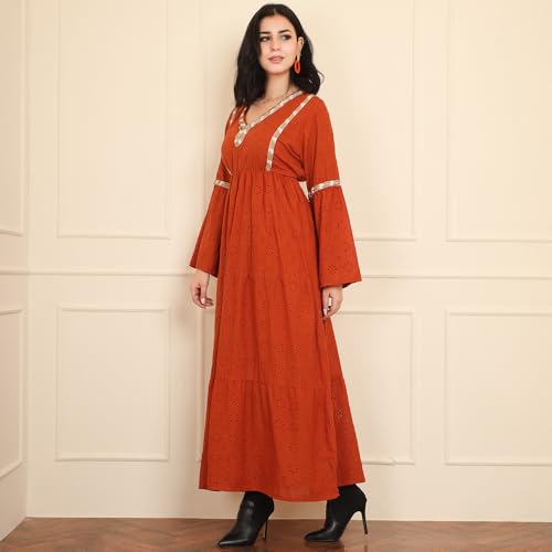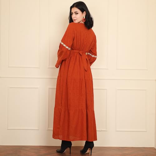 FRIDAYIN - Classical Elegant style V-neck Solid color Embroidery Hollow out Belt Embroidery lace Flared sleeve Long Dresses