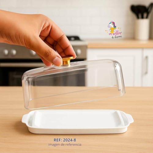 - تصميم أكريليك أنيق: غطاء أكريليك شفاف يحافظ على الزبدة مرئية وطازجة بينما يضيف المقبض الذهبي لمسة من الفخامة إلى مطبخك أو طاولة الطعام.
