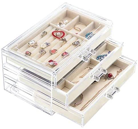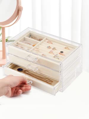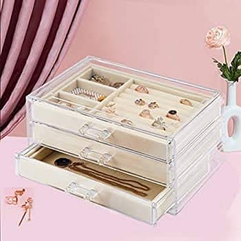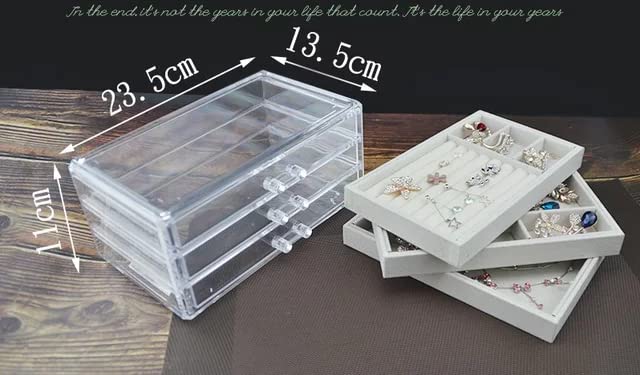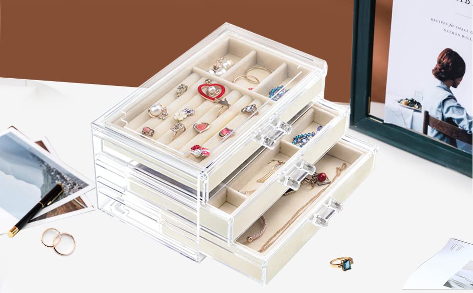 Generic - صندوق تخزين مجوهرات اكريليك شفاف- 3 ادراج قابلة للازالة- بطانة بيج داخلية- يناسب النمط- (23 سم × 10 سم × 13.5 سم)