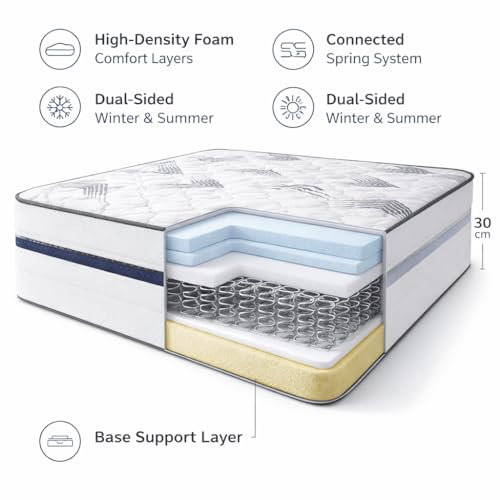 - 🛏️ Connected Spring Mattress: 30 cm height with high-density Super Soft foam, featuring a dual-sided design with summer and winter sides for all-season comfort.