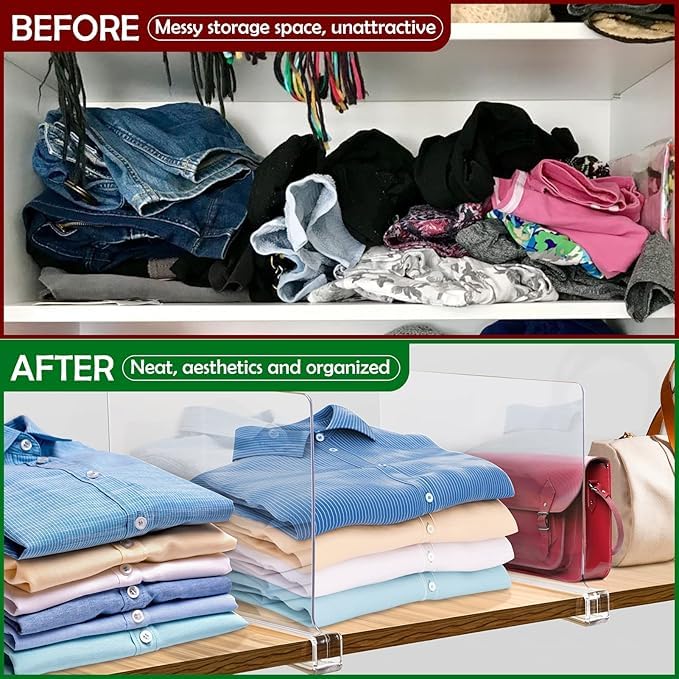 - No More Cluttered Shelves – Tired of piles of clothes and mixed-up bags? These acrylic closet dividers create clear sections so everything has its place—no more messy mornings.