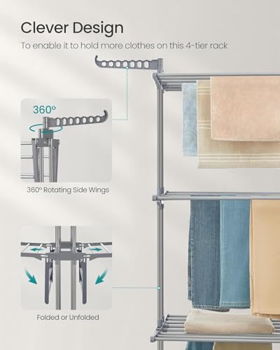 - 🧺 مساحة تجفيف كبيرة بثلاثة مستويات - 6 صواني قابلة للسحب وجناحان جانبيان قابلان للطي يوفران مساحة واسعة لتجفيف الفوط، والقمصان، والبلوفرات، والطواقي، والمعاطف، والفساتين، والأحذية، وغير ذلك. تتضمن 7 خطافات تعليق إضافية.