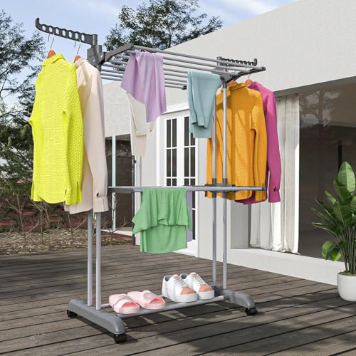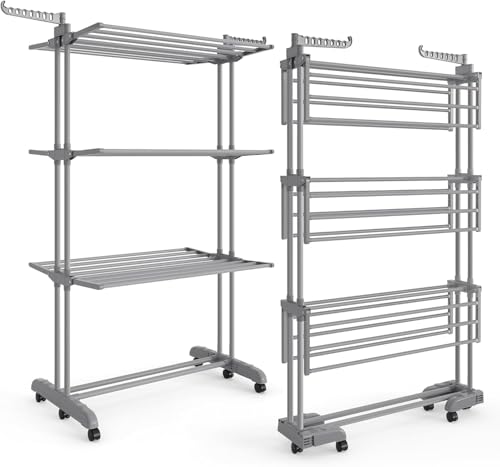 Generic - منشر غسيل قابل للطي، رف تجفيف ملابس من 3 مستويات، حامل تجفيف ملابس من الفولاذ المقاوم للصدأ مع جناحين جانبيين (لون رمادي)