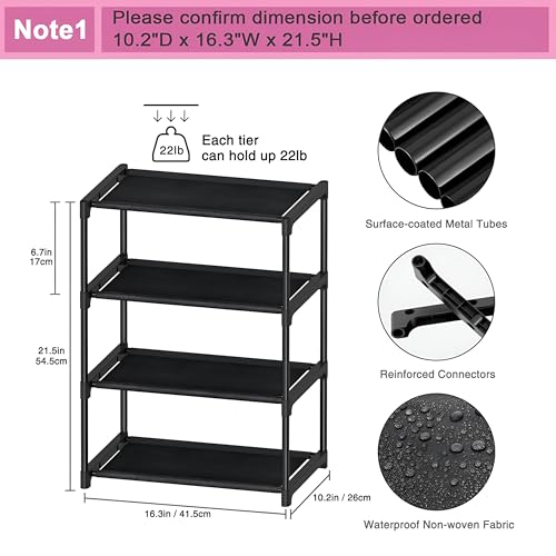 - تحقق مرة أخرى من المقاس: 16.3 انش × 10.2 انش × 21.5 انش [رف أحذية أسود من 4 طبقات] رف أحذية قائم بذاته مصنوع من طبقة قماش غير منسوجة متينة مقاومة للماء وموصلات بلاستيكية معززة وأنابيب معدنية سميكة سوداء. هيكل بسيط، ولكن قدرة تحمل قوية وثبات جيد