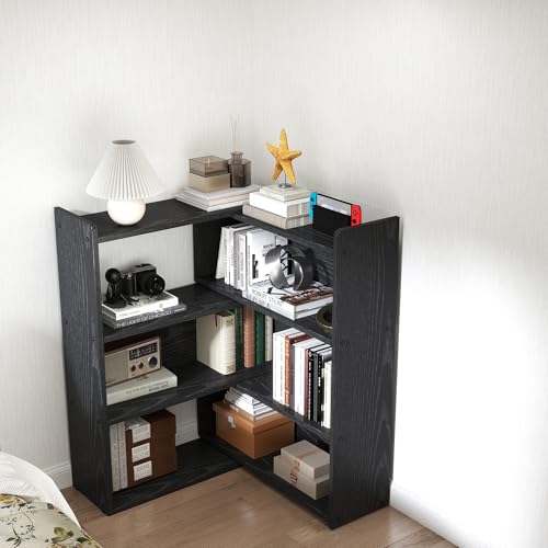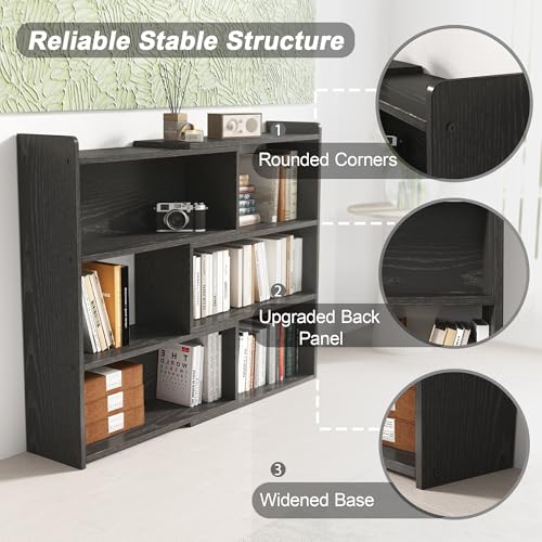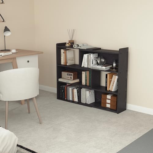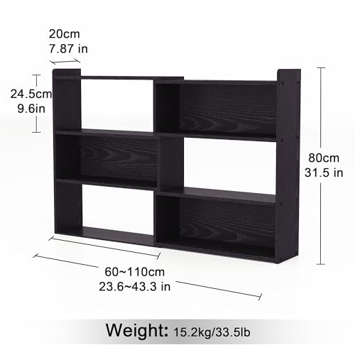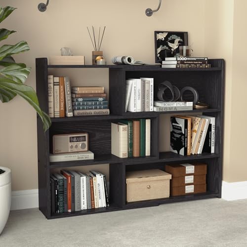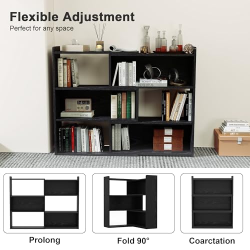 Cmishe - خزانة كتب منخفضة من كميشي، خزانة كتب خشبية من 4 طبقات قائمة على الارض قابلة للتوسيع بعرض 25-47 انش، مع اطار لوحات جانبية للمنزل والمكتب (اسود)
