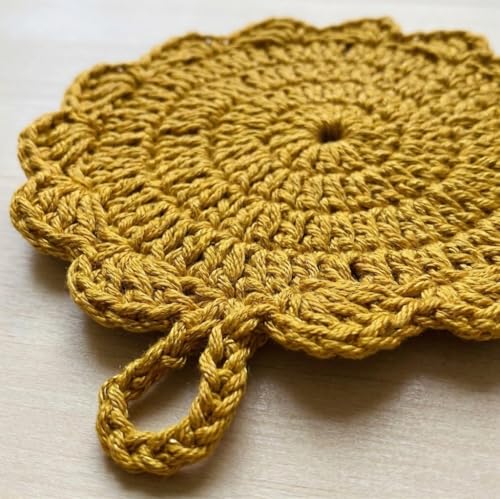 Generic - كوستر وحامل لأواني الطهي ( مساكه ) كروشيه هاند ميد للأكواب والأواني الساخنة قطر 15 سم ، لون أصفر خردلي، مع حلقة تعليق