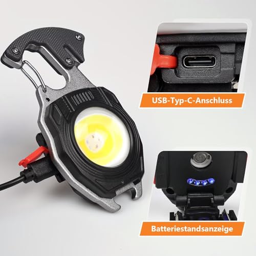 - Super Bright and Versatile: COB keychain work light Emitting up to 1200 lumens of light, equipped with 800 mA built-in polymer lithium battery and comes with a Type-C charging cable. It has 4 power displays to monitor power usage in real-time. this handheld flashlight offers a wider range of bright light and 7 different modes to meet your needs in different workplaces.
