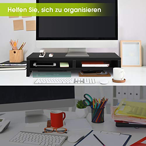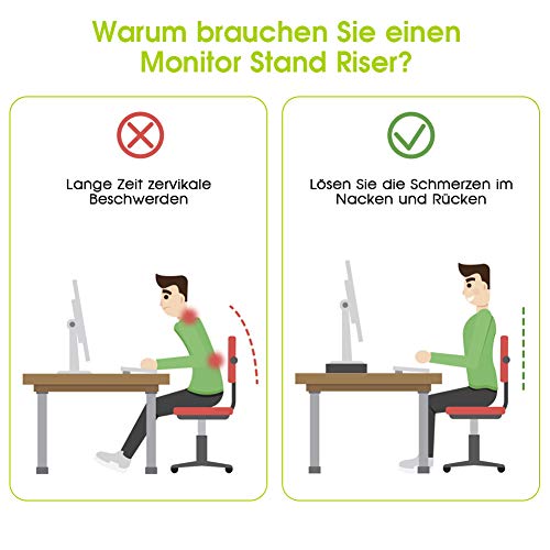 - ERGONOMIC MONITOR STAND: keeps your monitor at an ideal eye level for an ergonomically comfortable viewing angle, helps to improve the sitting position and relieve or even prevent the strain and pain in the neck, shoulder and back