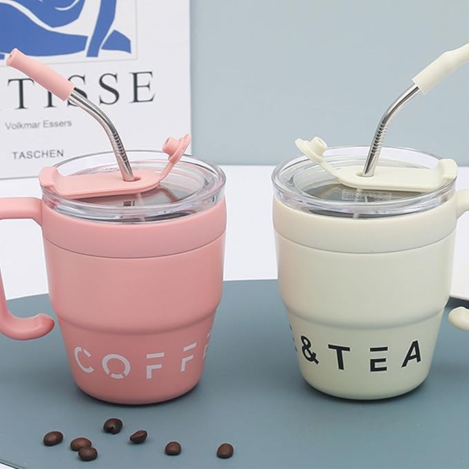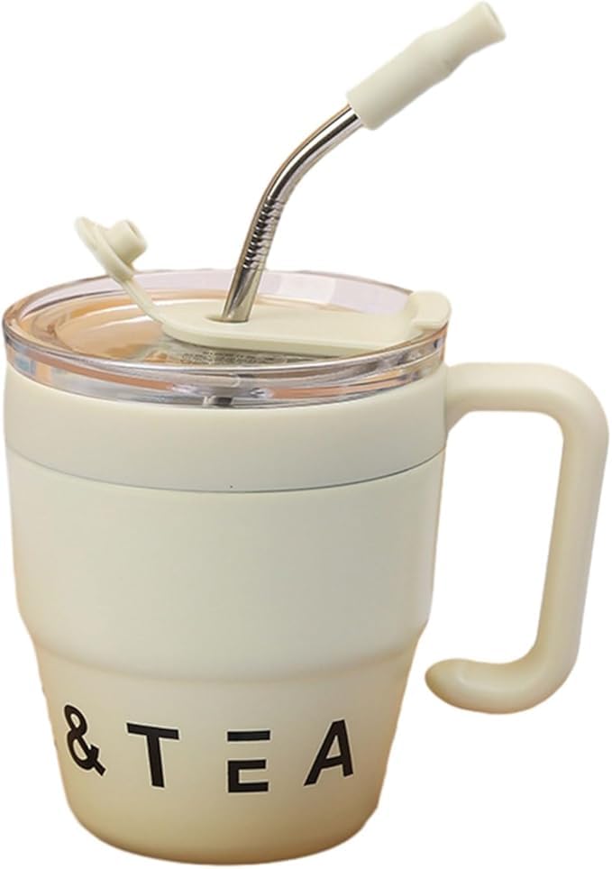Happy Home - Coffee Cup with Handle and Straw Lid 480ML Travel Mug Water Cup Milk Mug Stainless Steel Material Suitable for Drinks Handle Straw Cup (White)
