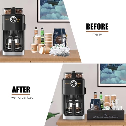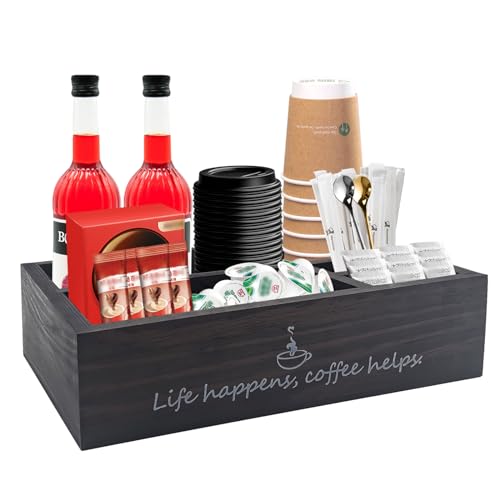 - COFFEE STATION ORGANIZER. Made of 100% solid wood, this coffee station organizer and storage bin box features a premium quality. Make it a coffee bar accessories organizer, coffee pods holder, or kitchen storage organizer for the countertop. Heavy-duty metal handles would make it super easy to carry or move this coffee organizer!
