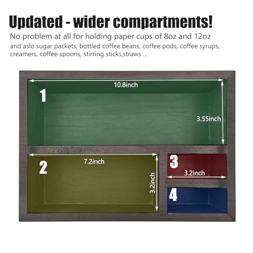 - EFFICIENT COFFEE ORGANIZER. This storage basket is partitioned into four compartments, providing efficient solution to clear up your kitchen countertop, coffee table, buffet table, coffee bar, or office coffee station. Keep coffee accessories and coffeee condiments well organized!