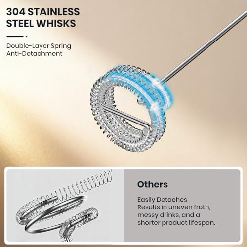 - 3 Whisk Attachments: This electric stirrer comes with 3 detachable whisk heads—the spring whisk for creamy froths, the balloon whisk for whipping and mixing, and the hook whisk for stirring and blending. Made from durable 304 stainless steel, it’s easy to clean with a simple rinse or wipe, keeping your coffee frother ready for the next use