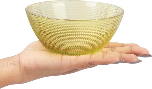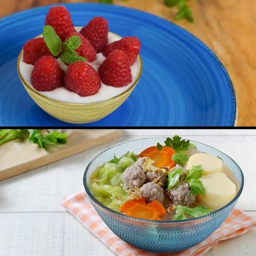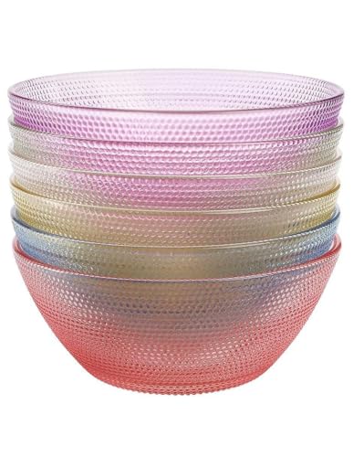 - FOOD-SAFE BOWLS: This set of 6 glass bowls is perfect for all of your food serving/meal prep needs. The bowls come in 5 translucent colours, including blue, purple, pink, yellow, and 2 clear bowls. Each bowl measures W11.3 x H5cm (4.45 x 1.97 inches), with a capacity of 350ml (12oz). Our versatile, food-safe bowls are great for many different purposes and will have many daily uses. When not in use, the bowls are stackable, saving on storage space and keeping your kitchen tidy.