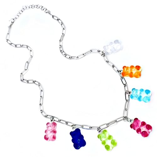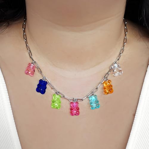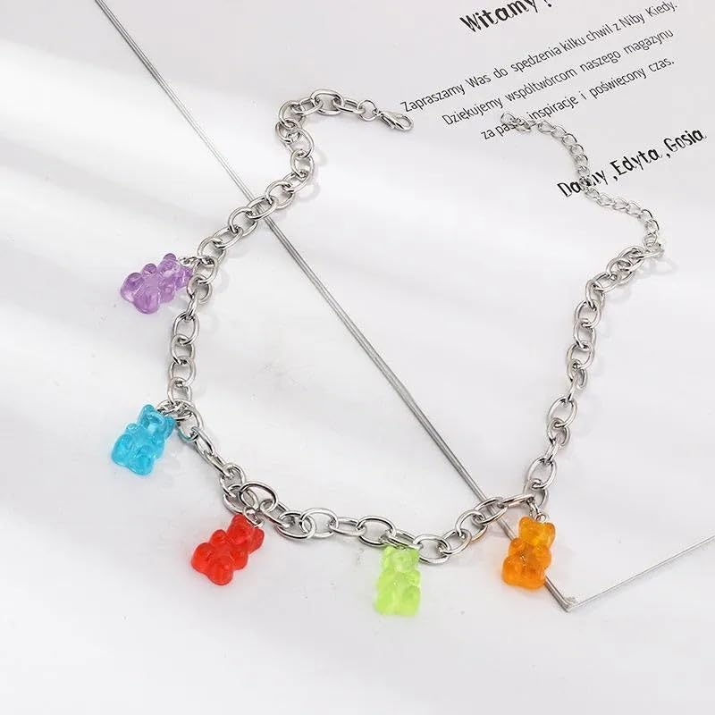 Generic - Colorful Gummy Bear Charm Necklace, Silver Chain with Multi-Colored Bear Pendants
