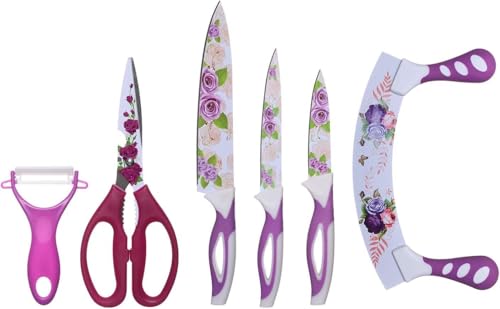 - COMPLETE SET: 6-piece kitchen set includes a chef knife, bread knife, paring knife, peeler, kitchen scissors in beautiful pastel colours