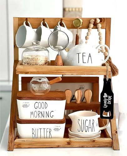 - Two‑tier design provides generous shelving; the upper tier holds mugs and accessories while the lower shelves store jars, teapots and containers, maximising counter space.