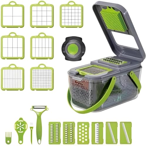 • This manual vegetable cutter offers 22 versatile functions in one compact device, including 13 interchangeable blades and an additional peeler, enabling precise slicing, dicing, shredding, and grating of vegetables like onions, carrots, potatoes, tomatoes, and even hard cheeses or hard-boiled eggs with adjustable thickness options.