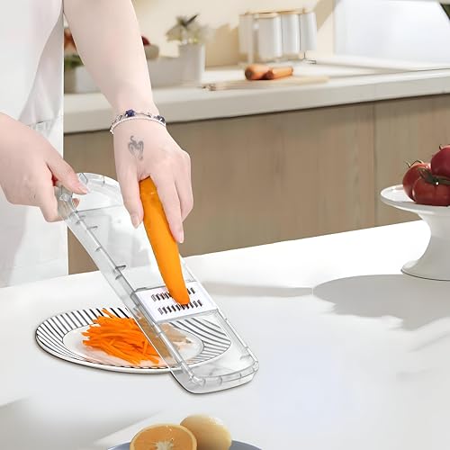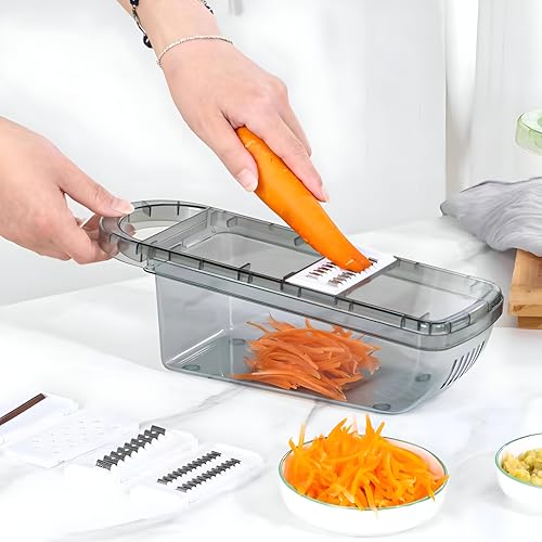 - Designed for broad culinary needs, the tool handles carrots, cucumbers, onions, potatoes, fruits and other vegetables, and includes a built‑in container to collect grated produce, all presented in a sleek black‑transparent finish for easy storage.
