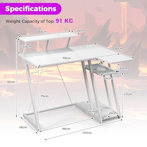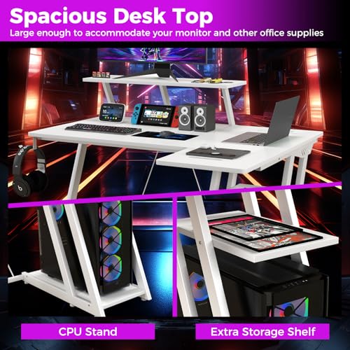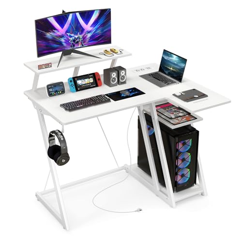 Auzy's Choice - Computer Desk w/Built-in Charge Station, Metal Frame Gaming Desk w/Monitor Shelf, Home Office Desk PC Desk w/CPU Stand & Earphone Hook, Modern Writing Desk Workstation Table for Office Room (White)