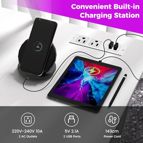 - Convenient Built-in Charging Station: This computer desk offers great convenience for electronic device users. The built-in charging station includes 2 AC outlets (220V-240V/10A) and 2 USB ports (5V/2.1A) for charging cell phones, iPads and other electronic devices, so you can avoid the worry of running out of power.