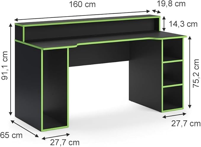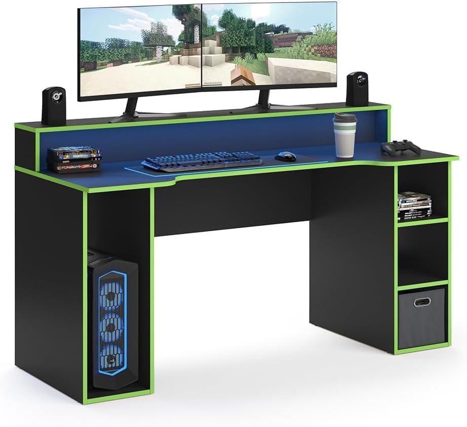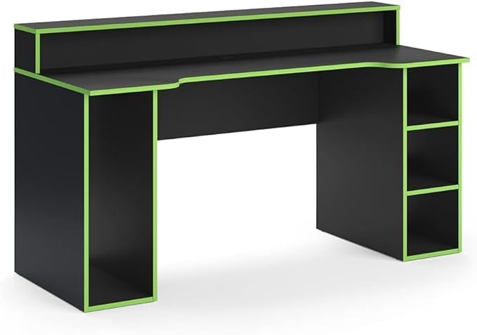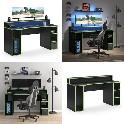 Generic - طاولة ألعاب للكمبيوتر، أسود مع حواف خضراء، مع رف علوي ومساحة تخزين جانبية، تصميم عصري لغرفة الألعاب، 160 سم × 75.2 سم