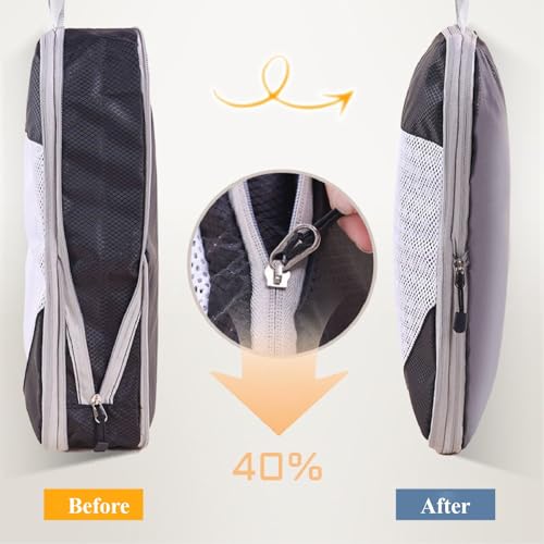 - SPACE-SAVING: Compression design allows you to reduce clothing volume,the storage bags feature a clever double-zipper design, consisting of an upper zipper and a lower zipper. You can adjust the volume of the storage bags according to the amount of your clothing, which helps to keep your luggage even tidier. Notably, the compression depends on the material of your clothes. If they are down jackets or some other easily fluffy clothing, the compression effect will be better than that of other clothes. Maximizing suitcase space and keeping items neatly organized.