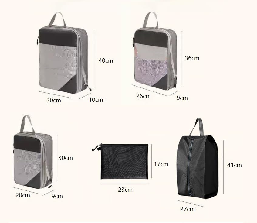 - VERSATILE SIZES: Multiple storage cubes and bags dimensions accommodate everything from small accessories to bulky clothing, perfect for efficient luggage organization. The detail dimensions are, Extra-large cube: 40cm * 39cm*10cm, Large cube: 40cm * 30cm * 10cm, Medium cube: 36cm * 25cm * 10cm, Small cube: 30cm * 20cm * 10cm, Sock bag: 34cm * 9cm * 12cm, Shoe bag: 40cm * 22cm, Flat pouch: 34cm * 25cm, Drawstring pouch: 33cm * 50cm.