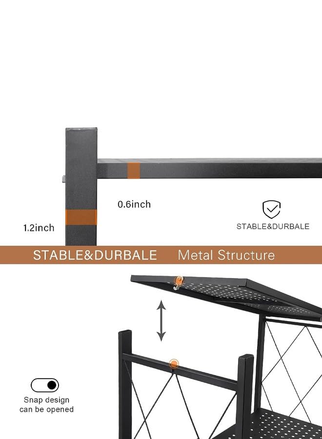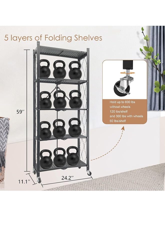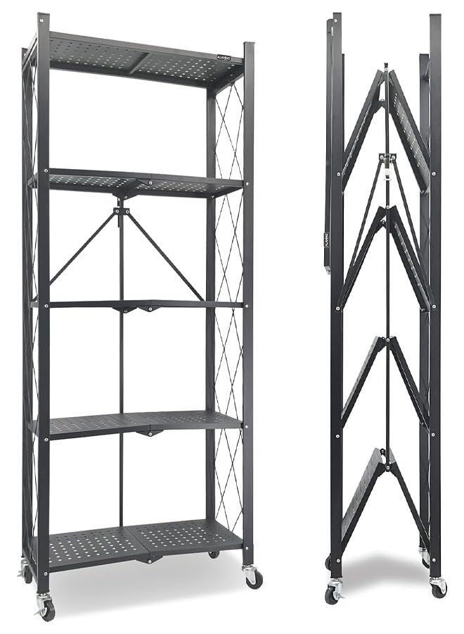 - وحدة الرفوف مصنوعة من حديد متين للغاية، مضادة للصدأ ومضادة للتآكل ومستقرة. تحمل ما يصل إلى 600 باوند بدون عجلات (120 باوند/رف)، و300 مع عجلات (60 باوند/رف).