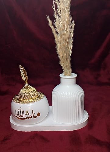 Generic - طقم ديكور تجريدي انيق مصنوع يدويا بنسبة 100% من كونكريت (أبيض) مكون من فازه وكوستر بيضاوي ومبخره بالارابيسك والهيش اللى في الفازه هديه