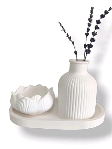Generic - CONCRETE Home Decor Set, 3 Piece Vase and Incense Burner, White Grooved Design, Handmade with Tray