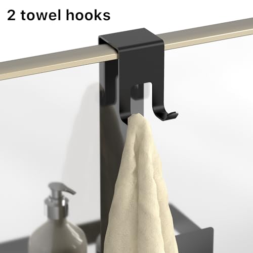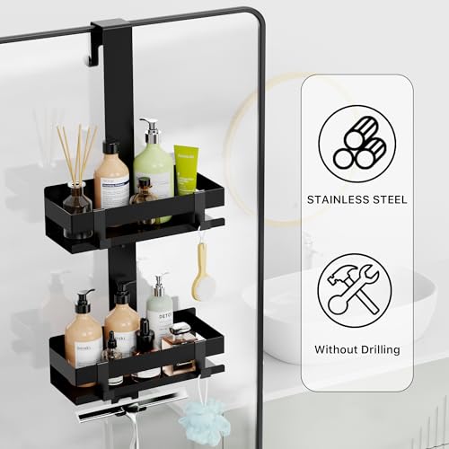 Cooeco - Black Shower Shelf no Drilling - Stainless Steel Over Door Shower Caddy, Shower Soap Holders for Bathroom Showers with 4 Hooks for Glass Door Up to 35mm