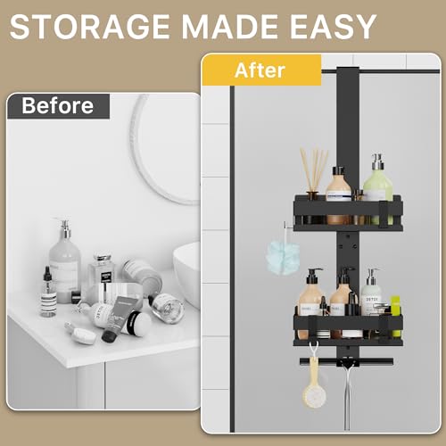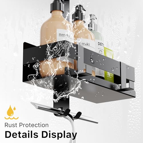 - ANTI-SCRATCH DESIGN: The black shower caddy is equipped with 2 suction cups to better secure the shower shelf. The shower shelf to hang the rubber bumpers on the back of the hooks prevent the hooks from scratching the glass door.