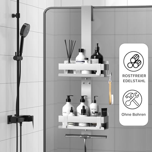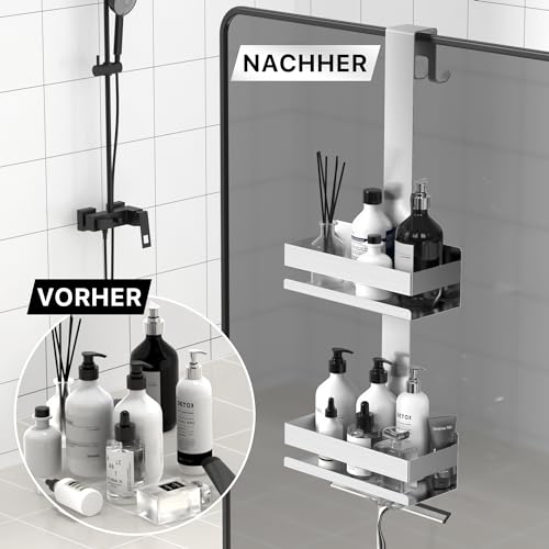 Cooeco - Shower shelf for hanging, double layer shower shelf for hanging on shower cubicles, stainless steel shower basket for hanging, easy attachment without drilling on the glass wall
