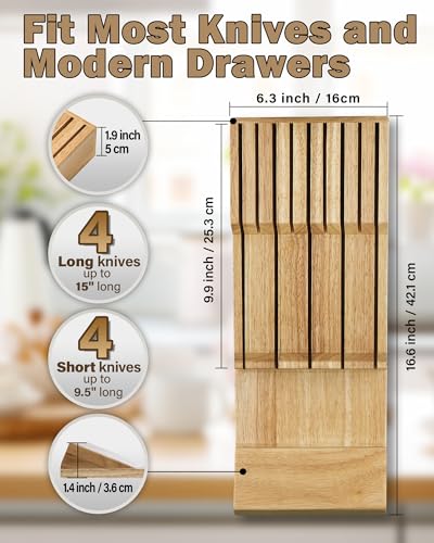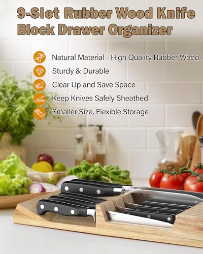 - 【Durable Material】 In-Drawer Knife Organizer 9-Slot,made of natural rubber wood that is hard and durable, hygienic, and light with a burnish to satiny feel.