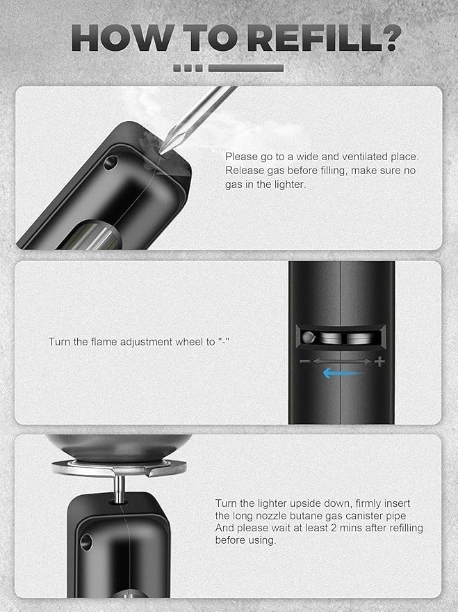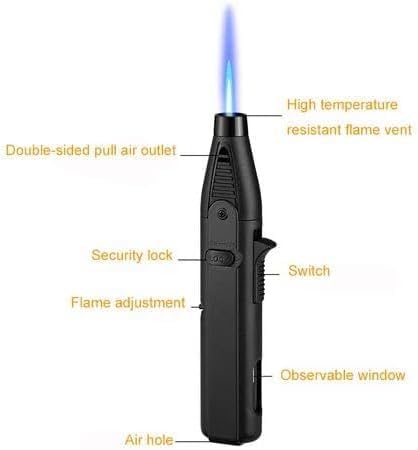 • ولاعة شعلة البيوتان هذه قابلة لإعادة التعبئة مقارنة بالولاعات ذات الاستخدام الواحد، مما يسمح بإعادة التعبئة المتعددة. يعد ضبط ارتفاع اللهب أمرًا سهلاً عن طريق تدوير عجلة الولاعة على الجانب.